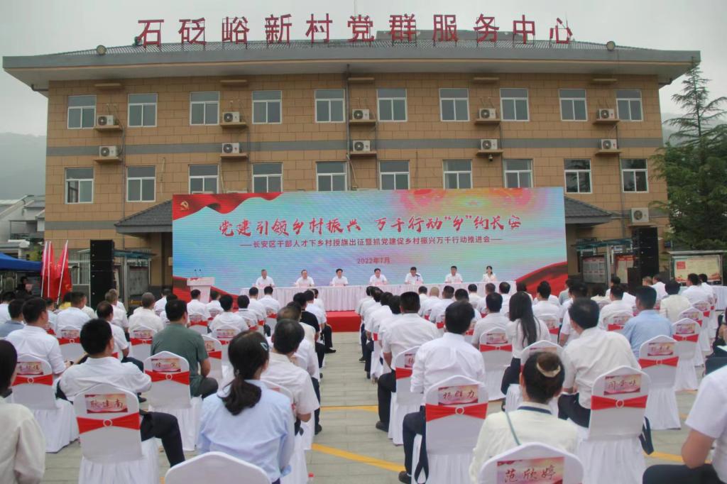 为认真落实党中央关于实施乡村振兴战略的决策部署,并按照西安市委办公厅、市政府办公厅《印发〈关于深入推进抓党建促乡村振兴开展“万名干部人才下乡村”行动的意见(试行)〉〈关于深入推进抓党建促乡村振兴开展“千企联千村”行动的意见〉的通知》(市办字〔2022〕37号)的要求,鼓励支持退出领导岗位干部、退休干部、新任职年轻干部和各类人才到乡村一线贡献才智、干事创业,长安区区委于2022年7月14日15:00在五台街道石砭峪新村党建文化广场举办“党建引领乡村振兴、万千行动‘乡’约长安”—长安区干部人才下乡村授旗出征暨抓党建促乡村振兴万千行动推进会。