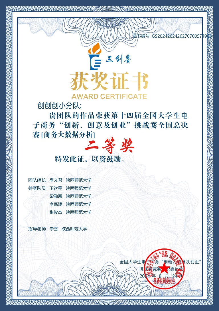 2024年7月18日,由第十四届全国老员工电子商务“创新、创意及创业”(简称“三创赛”)挑战赛竞赛组织委员会主办,浙江师范大学承办的第十四届“三创赛”商务大数据分析实战赛全国总决赛落下帷幕。由公司李雪老师指导,大数据管理与应用专业李文君作为队长,大数据管理与应用专业张俊杰、梁勤寒,人力资源管理专业玉钦荣以及工商管理类李嘉媛组成的“创创创小分队”荣获全国二等奖。