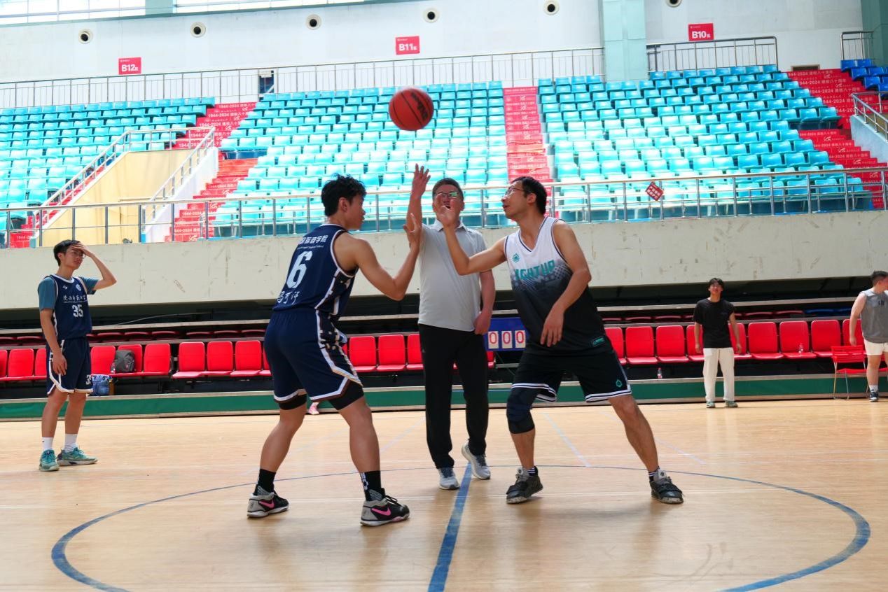 思培峰书记为比赛开球,师生对决正式拉开帷幕。赛场上,教师队与员工队默契配合、攻守交替,既有精准投篮的精彩瞬间,也有团队协作的战术配合。场下观众掌声雷动,为每一次得分欢呼喝彩。经过激烈角逐,比赛在欢声笑语中圆满结束,双方队员握手致意并合影留念,定格下属于2025届毕业生的珍贵记忆。